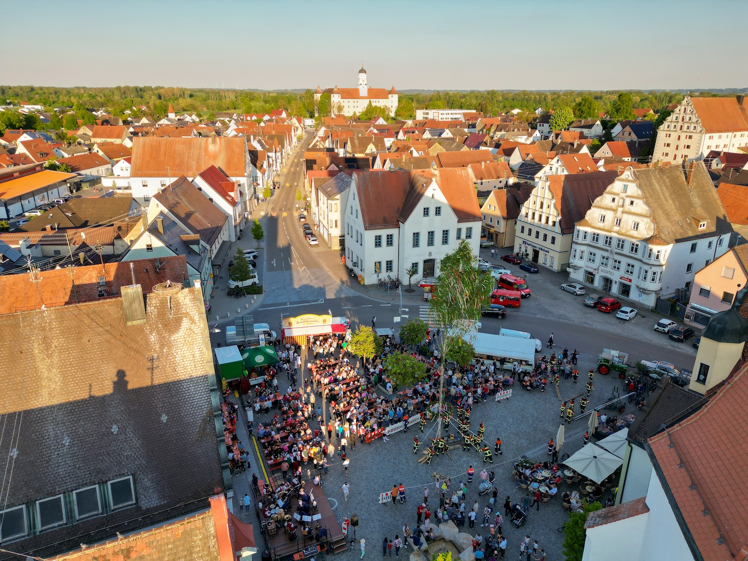 Traditionell am Vorabend zum 1. Mai hatten wir auch in diesem Jahr wieder die Ehre, den städtischen Maibaum auf dem Höchstädter Marktplatz stellen zu dürfen. Nach einem Festzug vom Bauhof zum Marktplatz stellten wir ganz klassisch mit sogenannten „Schwalben“ den Baum innerhalb von einer Stunde von Hand.